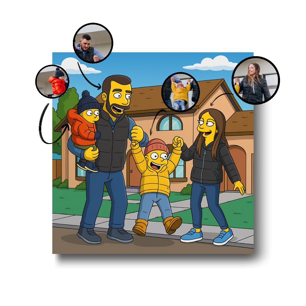 Máte rádi nekonečný animovaný seriál a znáte zpaměti jména všech obyvatel legendárního amerického městečka? Staňte se součástí žlutého vesmíru! Zašlete nám svou fotografii a náš tým zkušených ilustrátorů nechá vaši podobu i legendární dům ožít na malířském plátně. Před proslulým sídlem žluté rodinky můžete zapózovat sami, s rodinou, domácím mazlíčkem či skupinou přátel. Garáž roztržitého pána domu je připravena na zaparkování vašeho plechového miláčka.
